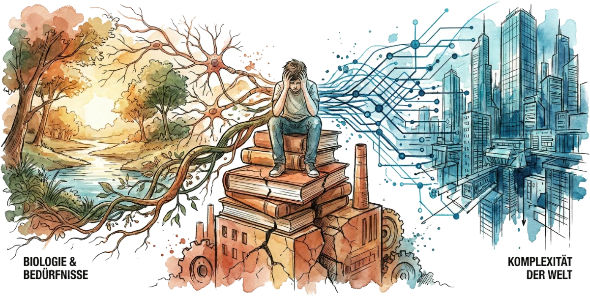Die Dringlichkeit von Colearning leitet sich nicht aus einem idealistischen Wunsch nach “netterem Lernen” ab, sondern aus einer systemischen Analyse des Status quo. Die gegenwärtigen Bildungssysteme leiden unter der Last eines doppelten Widerspruchs: dem inneren Konflikt mit dem menschlichen Bauplan und dem äusseren, systemischen Konflikt mit der Dynamik der heutigen Welt. Das Ergebnis ist Stress, Entfremdung und steigende Kosten für ein System, das immer mehr reparieren muss, was es durch seine Struktur überhaupt erst verursacht.