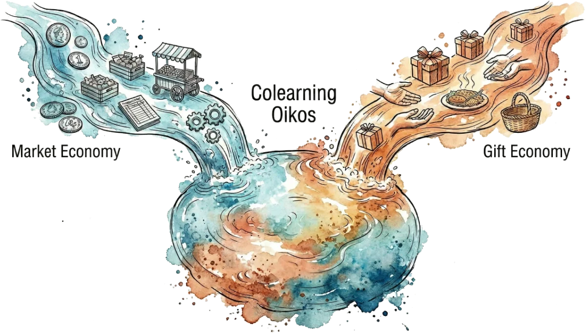 In Colearning, we don't measure success by the individual's bank balance, but by the quality of our relationships and by the resilience and beauty of the shared living space. A community that manages its own Oikos – that is capable of circulating food, energy, knowledge, and care locally – is incomparably more resilient in a volatile world ("Red World") than a collection of isolated consumers ("antifragile").