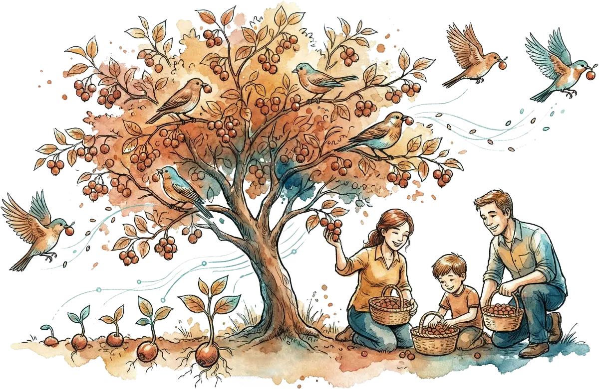 We learn from nature, inspired by the work of biologist Robin Wall Kimmerer on the Serviceberry. A tree doesn't hoard its fruits to increase their "value" through artificial scarcity. It gives them lavishly to the birds. This is not charity, but a survival strategy. The birds spread the seeds. The gift secures the tree's future better than keeping.