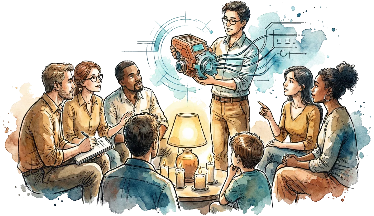 But at the Campfire, you never learn alone. When someone "pulls" a solution, those sitting around benefit through legitimate eavesdropping (Legitimate Peripheral Participation). Knowledge diffuses incidentally into the group – like warmth that reaches everyone, even those who didn't just add wood. Thus the individual solution becomes a collective treasure.